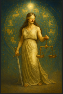天秤座は、「法と性(男女、家族)と金」の問題を浮き彫りにし、社会を改善する働きがあります。天秤座の象徴、ギリシャ神話の女神アストレイアは、目隠しをしています。これは、自分の正義ではなく、神の法則によって、判断と改善が行われる事を表しています。